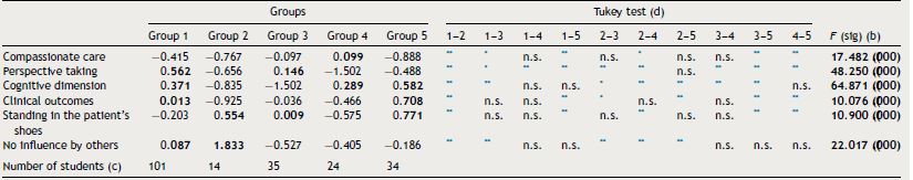 Group 1 of the cluster analysis groups the largest number of students (101), showing a positive relationship with the dimensions “perspective taking”, “cognitive dimension”, “clinical outcomes”, “the influence by the others” and negative with dimensions “compassionate care” and “patient standing in shoes”. Group 2 of the cluster, group of 14 students, shows highly positive relationship with the dimension “no influence by others” and also positive with “standing in patient shoes” and presents negative relation with the other dimensions. Group 3 of the cluster, group of 35 students, presents positive relationship with the dimension “perspective taking” and negative or null with the others. Group 4 of the cluster, group of 24 students, shows a positive relationship with “cognitive dimension” and “compassionate care” and negative relationship with the others. Group 5 of the cluster, group of 34 students, presents a positive relationship with the “cognitive dimension”, “clinical outcomes” and “standing in patient shoes” and negative relationship with the others.