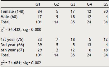 Taking into account the distribution of students over the course and the groups identified in the cluster analysis, it was possible to verify their distribution by various groups, supported by the chi-square analysis.