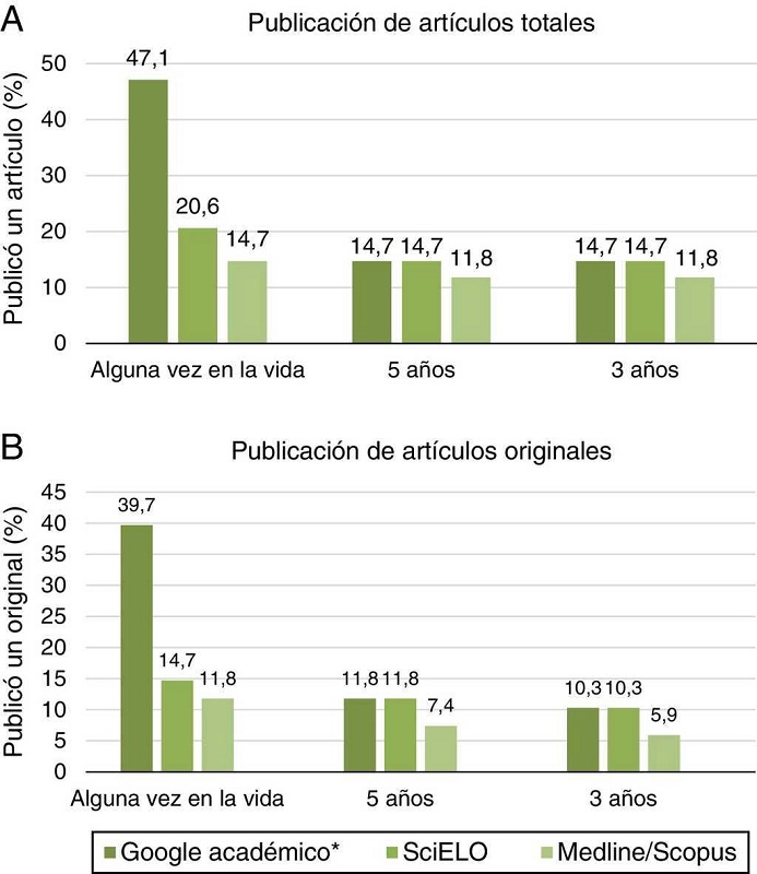 Del total de 68 asesores, se encontró que menos de la mitad 47,1% (32/68) habían publicado alguna vez en su vida algún artículo (artículo original, reporte de caso, carta al editor, etc.), y el 39,7% publicó alguna vez un artículo original. El 11,8% de los asesores publicó algún artículo en los últimos 3 años en Medline y Scopus; mientras que solo el 5,9% publicó un artículo original en dichas bases de datos en el mismo periodo (fig. 1A y B). Doce de los asesores se hallaron como autores corresponsales en las publicaciones, mientras que los demás (20/32) como coautores.
