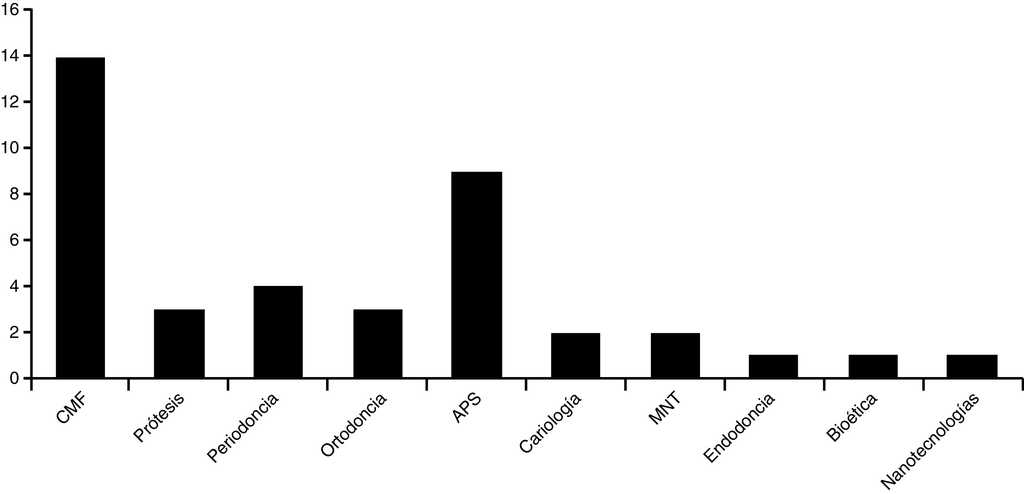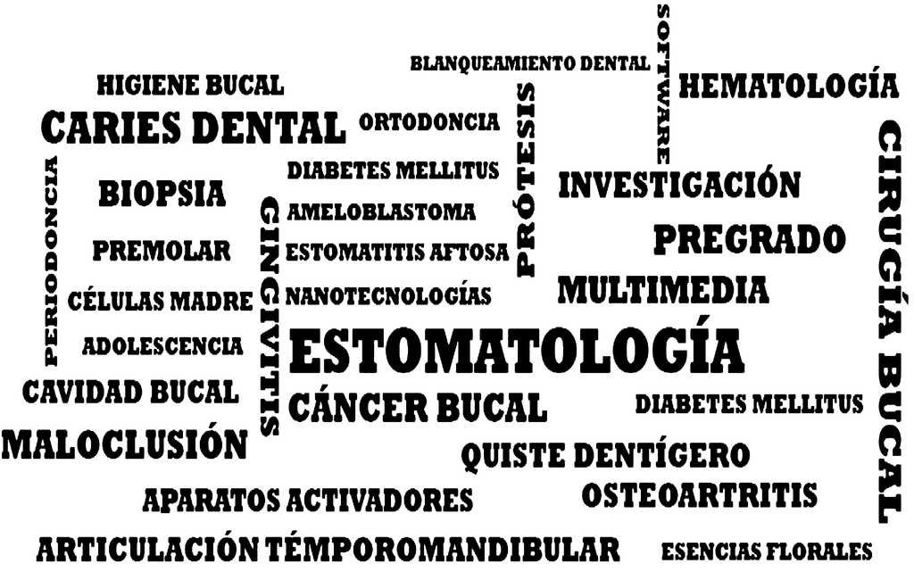 En la figura 1 se muestra la distribución de los estudios según temática de investigación, de los cuales 14 fueron de Cirugía maxilofacial, 9 de Atención Primaria de Salud y 4 Periodoncia; las áreas menos representadas fueron las de: Endodoncia, Bioética y Nanotecnologías con una investigación respectivamente. La figura 2 muestra la nube de palabras clave; «estomatología» y «caries dental» fueron las palabras clave más citadas.
