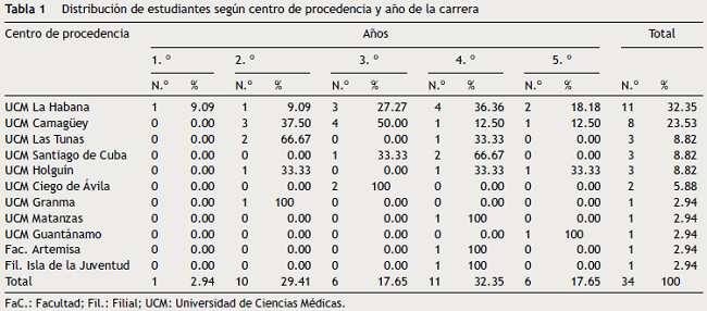 A pesar de que el evento tuvo carácter internacional, no existió coautoría con estudiantes de otros países. Treinta y cuatro estudiantes participaron en la cita científica estudiantil siendo la Universidad de Ciencias Médicas de La Habana el centro mayormente representado con 11 participantes, seguida por su homónima de Camagüey con 8. Universidades médicas como la de: Granma, Matanzas, Guantánamo, Artemisa y la Filial de Ciencias Médicas de la Isla de la Juventud contaron con la participación de un representante. Con respecto a la distribución de estudiantes según año de la carrera, se observa un predominio de estudiantes de 4.o año (11/34); el año menos representado fue 1. o (2.94%) (tabla 1).