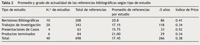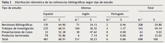 Predominaron los Trabajos de Investigación (50.00%), seguidos por las Revisiones Bibliográficas (10/20); las Presentaciones de Casos fueron los estudios menos representados (10.00%). El promedio de referencias por investigación osciló entre 15.75 y 21.00; la media aritmética para este indicador fue de 17.45. El índice de Price osciló entre 0.34 y 0.52; el valor promedio fue de 0.38 (tabla 2). De las 698 referencias citadas, 481 (68.91%) eran en idioma español, 211 (30.23%) en inglés y 6 (0.86%) en portugués (tabla 3).