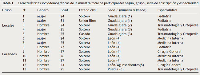 Se analizaron bajo el método fenomenológico las vivencias y experiencias de 13 residentes (5 mujeres y 8 hombres) durante su primer año de formación. La selección de participantes se realizó por muestreo bola de nieve13. Se inició con 4 sujetos, y a cada uno se le solicitó nos refiriera a otro u otros residentes; la única condición solicitada fue haber iniciado en 2015 una especialidad médica. Todos los participantes estaban adscritos a instituciones públicas. Se conformaron dos grupos: a) locales) y b) foráneos, y se distinguió entre grupos y sedes (ver tabla 1).