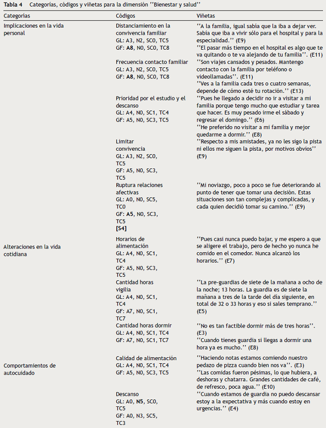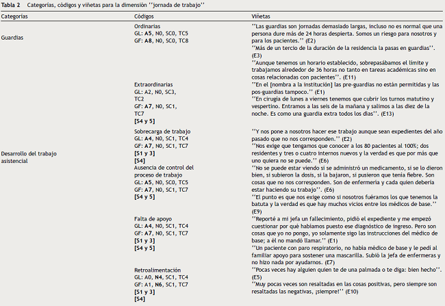 Al respecto, Hurst et al.23 describen una serie de altibajos durante la formación de residentes; coincidimos con que al inicio del año prevalece la ansiedad y la excitabilidad, pero en nuestro estudio las vivencias y experiencias relacionadas con la fatiga comenzaron alrededor del primer trimestre y estuvieron relacionadas con la sobrecarga de trabajo, la falta de apoyo de los médicos de base, la imposibilidad de descanso, la mala alimentación y las deudas de sueño.