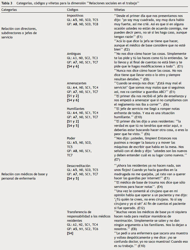 Resultados: La formación de los médicos residentes se caracterizó por sobrecarga de trabajo, ausencia de control y ambigüedad en los roles a desempeñar, falta de apoyo y escasez de recursos. Relaciones impositivas, amenazantes, humillantes y de poder con sus superiores jerárquicos. Desacreditación por parte de médicos de base, afectaciones a la vida personal, estrés y agotamiento físico y mental.