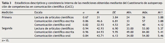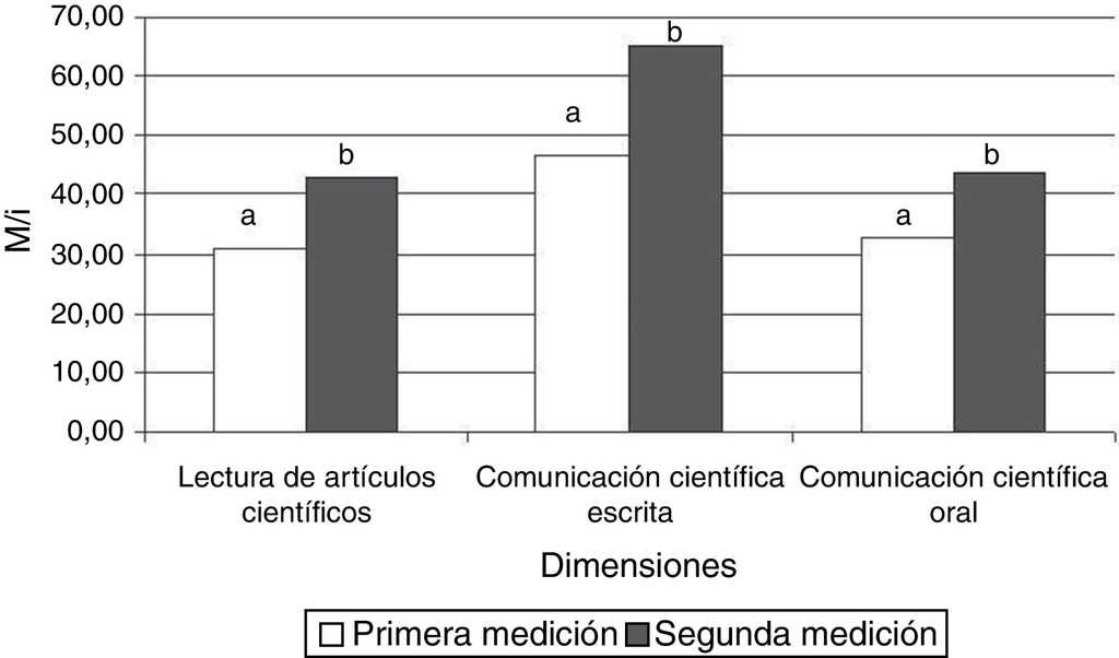 Se calculó el coeficiente M/i dividiendo la media de cada factor por el número de ítems para obtener promedios heurísticamente comparables. Se pudo observar que inicialmente los participantes poseían un mayor nivel autopercibido de competencias en comunicación científica oral que en escrita y en la lectura de artículos científicos (tabla 3). Luego de finalizar el taller, los niveles autopercibidos en todas las dimensiones de las competencias de comunicación científica estudiadas fueron similares, observándose un aumento significativo (p < 0.001) en todos los puntajes (tabla 3, fig. 1).