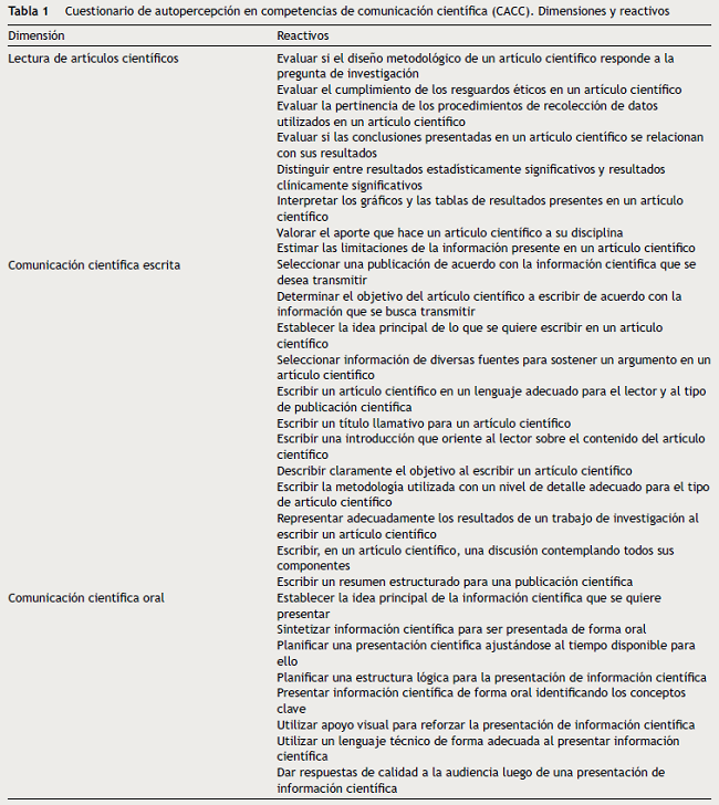 El CACC buscó evaluar el grado en que el estudiante percibe que posee las actitudes y habilidades necesarias para comprender y comunicar, de manera escrita u oral, información científica. El CACC estuvo compuesto por 28 reactivos, contemplados en 3 dimensiones, lo que se definió de acuerdo con lo descrito previamente por diversos autores9-16. La dimensión «lectura de artículos científicos» se definió como la capacidad de evaluar un artículo científico. La dimensión «comunicación científica escrita» se definió como la capacidad de comunicar información científica de forma escrita con un enfoque metódico. Finalmente, la dimensión «comunicación científica oral» se definió como la capacidad de comunicar información científica de forma oral mediante una presentación efectiva y estructurada. En este cuestionario los participantes debieron indicar, utilizando una escala tipo Likert de 1 a 7, el nivel de capacitación que ellos percibían poseer para realizar las actividades planteadas en cada reactivo, donde 1 correspondía a que el estudiante considera que no posee capacitación alguna y 7 a que el estudiante considera que posee un nivel avanzado de capacitación (tabla 1).