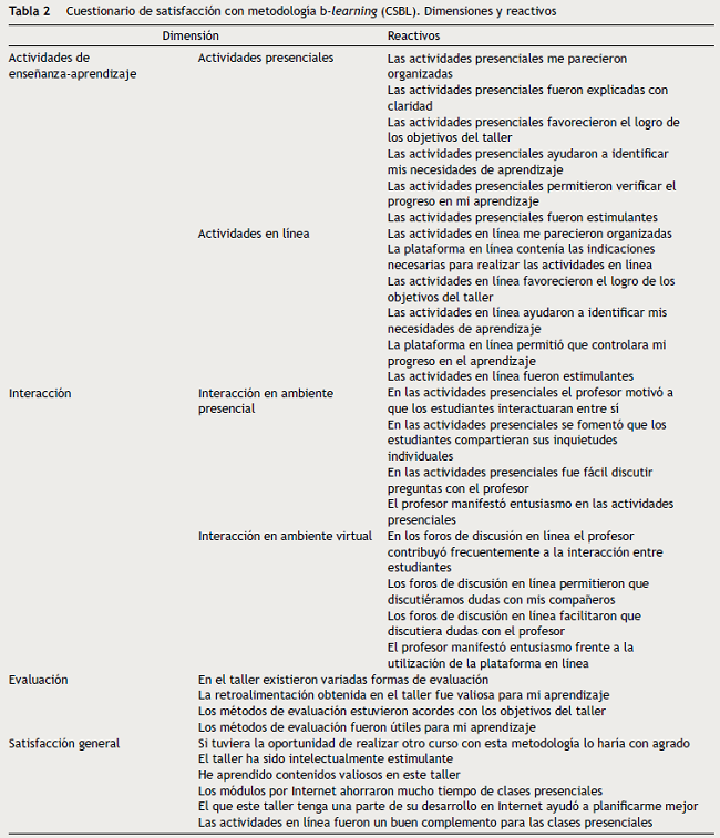 El CSMB buscó medir la satisfacción del estudiante con una metodología de aprendizaje que involucra tanto el aprendizaje presencial como el aprendizaje en línea. Su diseño se basó en literatura respecto a la evaluación de la satisfacción del estudiante con metodologías educativas30-32. Este cuestionario estuvo compuesto por 4 dimensiones: «actividades de enseñanza-aprendizaje», «interacción», «evaluación» y «satisfacción general». La dimensión «actividades de enseñanza-aprendizaje» contempló 2 subdimensiones: la subdimensión «actividades de enseñanza-aprendizaje presenciales», que se definió como la percepción del estudiante con relación a la calidad de las actividades presenciales, y la subdimensión «actividades de enseñanza-aprendizaje en línea», que se definió como la percepción del estudiante con relación a la calidad de las actividades en línea. La dimensión «interacción» también contempló 2 subdimensiones: la subdimensión «interacción en ambiente presencial», que se definió como la percepción del estudiante de la calidad de las interacciones estudiante-profesor y estudiante-estudiante en el ambiente presencial, y la subdimensión «interacción en ambiente virtual», que se definió como la percepción del estudiante de la calidad de las interacciones entre estudiante-profesor y estudiante-estudiante en el ambiente virtual. Por otro lado, la dimensión «evaluación» se definió como la percepción del estudiante con relación a la calidad de la evaluación, y la dimensión «satisfacción general» se definió como la percepción del estudiante sobre la calidad general del curso. En total, el cuestionario contó con 32 reactivos en forma de afirmaciones, para los cuales los participantes debieron indicar, utilizando una escala tipo Likert de 1 a 7, su grado de acuerdo con lo planteado, donde 1 correspondía a estar totalmente en desacuerdo con la afirmación y 7 a estar totalmente de acuerdo con la afirmación (tabla 2).