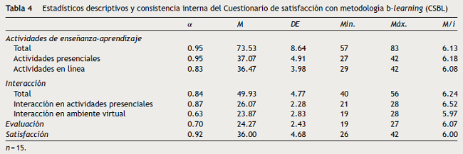 El CSMB obtuvo valores aceptables de confiabilidad en todos sus factores. Mediante el cálculo del coeficiente M/i se pudo observar que los participantes demostraron estar satisfechos con la metodología e indicaron poseer una mayor satisfacción con la interacción otorgada por ella y, particularmente, con la interacción en las actividades presenciales (tabla 4).