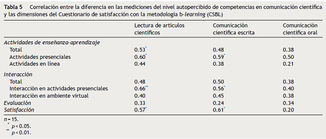 Resultados: Se pudo observar un aumento de las competencias en comunicación científica autopercibidas por los estudiantes luego de realizar el taller (p < 0.001). Asimismo, los participantes se mostraron satisfechos con la metodología y se encontraron relaciones estadísticamente significativas al evaluar la relación entre la diferencia de las mediciones en el nivel autopercibido de competencias en comunicación científica y las dimensiones del cuestionario de satisfacción con la metodología b-learning (p < 0.05).