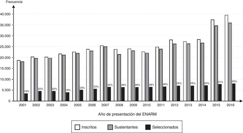 Aunque es evidente que el interés por la especialidad es quizá el factor más relevante para elegir7, el tipo de escuela de medicina, factores demográficos, los criterios de ingreso a la especialidad, la oferta y demanda de las plazas varía en cada país y son elementos que deben tomarse en cuenta cuando se analizan las particularidades del proceso de elección en cada país8. Por ejemplo, en diversos estudios se demuestra que en los países en los que se requiere de un financiamiento para pagar los estudios de medicina, es más probable que los estudiantes elijan una especialidad en la que tendrán más ingresos durante su formación y en la que de forma rápida empezarán a ganar dinero. Lo anterior sucede en Estados Unidos de América, pero en países en los que la educación es pública y no se requiere de un financiamiento, este factor económico no es determinante4,9. En el caso particular de México, el panorama para los médicos residentes presenta varios problemas: las asignaciones varían cada año de acuerdo con el número de plazas y el promedio de los residentes (inestabilidad), la asignación no es eficiente (se aplica el mismo examen para todas las especialidades y se puede solicitar una especialidad no tan demandada para ingresar), el mecanismo puede ser manipulable (se puede elegir una especialidad de ingreso menos complicado y ya dentro de la institución, solicitar un cambio a otro programa, por ejemplo) y cada año se congestiona10. En la figura 1, se puede apreciar el comportamiento en cuanto al número de plazas otorgadas y de sustentantes del Examen Nacional de Aspirantes a Residencias Médicas en México, de 2001 a 2016. Además de los problemas señalados, las instituciones de salud tienen una baja tasa de retención de los especialistas seleccionados (calculada en un 50%), tanto por falta de presupuesto para nuevas plazas como porque algunas zonas geográficas son poco atractivas o el hospital no cumple con las expectativas del médico residente, en términos de trabajo, pacientes o zona geográfica en la que pudiera ser colocado10.