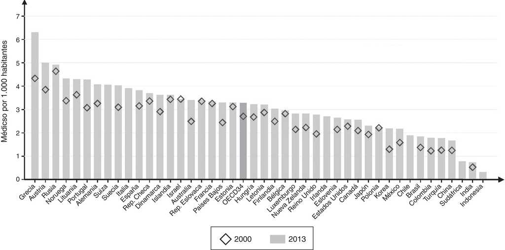 Otro problema que debe ser considerado es la oferta limitada de médicos y del número de especialistas por habitantes. Desde el año 2000, el número de médicos y de especialistas se ha incrementado en todas las naciones que forman parte de la Organización de Cooperación y Desarrollo Económico (OCDE), de forma particular en los países que tenían un número bajo en informes previos tales como Turquía, Corea y México11. El valor más alto de médicos por cada 1,000 habitantes es de 6.3 en Grecia, en México es de 2.2, y el promedio de los países que pertenecen a la OCDE es de 3.3 (fig. 2).