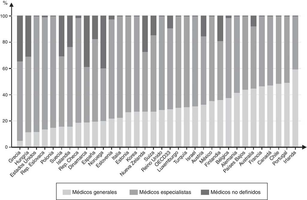 También es importante tomar en cuenta que la proporción de médicos especialistas y médicos generales se ha incrementado. Existe una clara tendencia mundial a que los médicos realicen algún tipo de especialización al terminar su formación como médicos generales. En los Estados Unidos de América, el 88% de los médicos hace una especialidad, con porcentajes similares en Eslovaquia y en Polonia. En otros países tiende a disminuir, con porcentajes cercanos al 50%, como en Francia, Canadá, Chile y Portugal. México representa un caso intermedio, con un 35% de médicos generales y un 65% de especialistas (fig. 3)11.