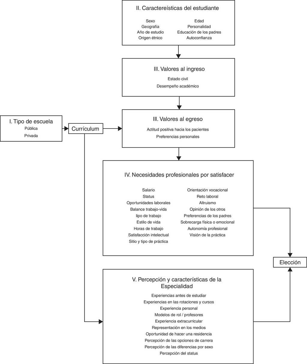 Bland y Meurer propusieron un modelo sobre los factores que influyen en la elección de una especialidad, agrupados en cinco categorías: el tipo de escuela en la que se formó el estudiante (pública o privada), las características del estudiante (demografía, personalidad), los valores del estudiante al egreso de la formación médica (preferencias personales), las necesidades a ser cumplidas durante la especialidad (ingreso, prestigio, tiempo libre) y la forma en que los estudiantes perciben la especialidad. El modelo de Bland-Meurer tiene aplicación para todas las especialidades, con particularidades por país y especialidad. Otros autores han propuesto un modelo específico para la elección de una especialidad de atención primaria, en el que se le da más peso al proceso de decisión desde la entrada a la carrera de medicina hasta que termina y la forma en que se modificó el proceso durante la carrera3,5.