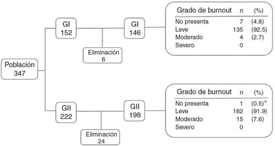 El número final de participantes fue de 344, 146 en GI y 198 para GII. Los grados de burnout encontrados fueron: en el grupo GI, 7 (4.8%) alumnos no presentaron burnout; 135 (92.5%) presentaron burnout leve y en 4 (2.7%) fue moderado. El grupo GII registró que 1 (0.5%) alumno no presentó burnout, 182 (91.9%) presentaron leve y 15 (7.6%) moderado. Ningún estudiante presentó burnout severo (Fig. 1).
