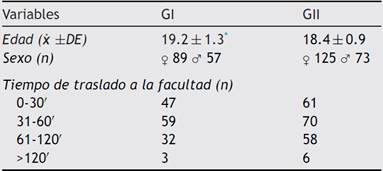 El análisis de las variables sociodemogáficas mostró diferencias estadísticamente significativas (p<0.001) respecto a la edad, GI (19.2±1.3) y GII (18.4±0.9). La presencia de burnout no presentó diferencias según el sexo de los estudiantes (p=0.750 U- Mann Whitney), ni tampoco tuvo relación con el tiempo de traslado (p=0.785 Kruskal Wallis) (Tabla 1).