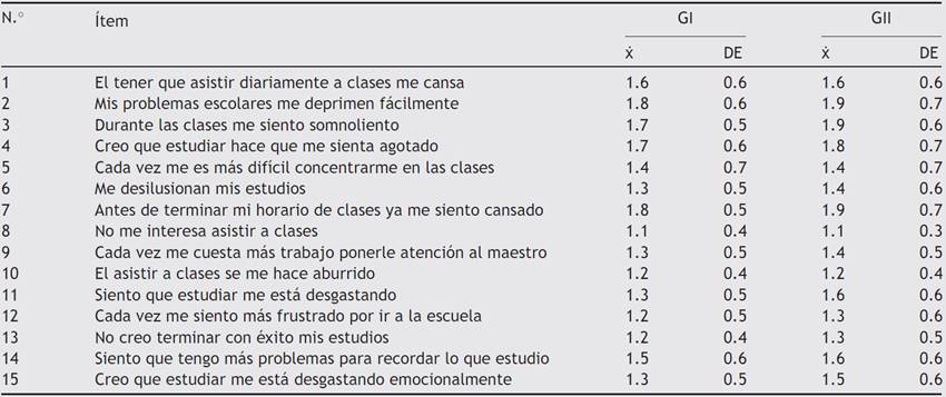 Los indicadores comportamentales más frecuentes fueron: mis problemas escolares me deprimen fácilmente, durante las clases me siento somnoliento y antes de terminar mi horario de clases ya me siento cansado. Los indicadores actitudinales más representados fueron: me desilusionan mis estudios, cada vez me siento más frustrado por ir a la escuela y no creo terminar con éxito mis estudios.
