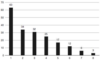 Se contabilizaron 550 autores firmantes, con un mínimo por artículo de uno y un máximo de 8, exceptuando elpapertitulado: «Burnouten médicos internos de pregrado del Hospital General de México Dr. Eduardo Liceaga», con 12 autores firmantes, que fue excluido del siguiente cálculo estadístico. El índice de colaboración, principal indicador de la colaboración en la producción científica publicada en una determinada revista, fue de 2.86 (Fig. 2).