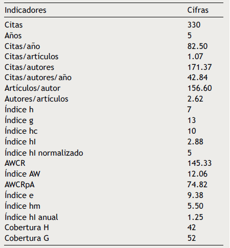 Method: A descriptive-retrospective bibliometric study of the documents published in the period 2012-2016 was performed. The studied variables were: total of numbers, total of articles, cites, average of cites per year, average of cites per articles, average of cites per authors, average of cites per authors per year, average of articles per author, average of authors per article, h index, g index, contemporary h index, hI index, normalized hI index, AWCR index, AW index, AWCRpA index, e index, hm index, annual hI index, H coverage, G coverage, documental typology, the authors’ affiliation, index of collaboration, bibliographical references, current relevance of the bibliography according to the index of Price and languages of the bibliographical references. The scienciometrics indicators were calculated using the software Harzing’s Publish or Perish 5 and taking Academic Google as database.