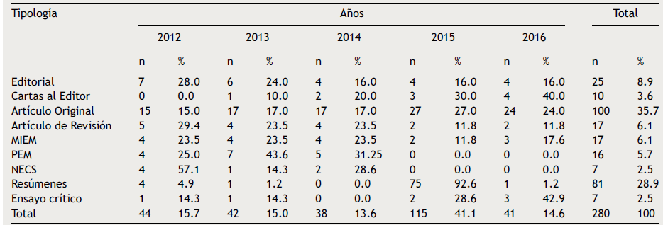 Se publicaron 280 artículos, con una media de ± 33.05 por año. El 2015 fue el año más productivo, con 115 papers, mientras que el 2014 fue el de menor productividad, con 38 artículos. Las secciones «Artículos Originales» y «Resúmenes» sobresalen como las tipologías documentales más utilizadas con 100 (20 ± 4.74 artículos por año) y 81 artículos, que representaron el 35.7 y el 28.9% del total, respectivamente (Tabla 2).