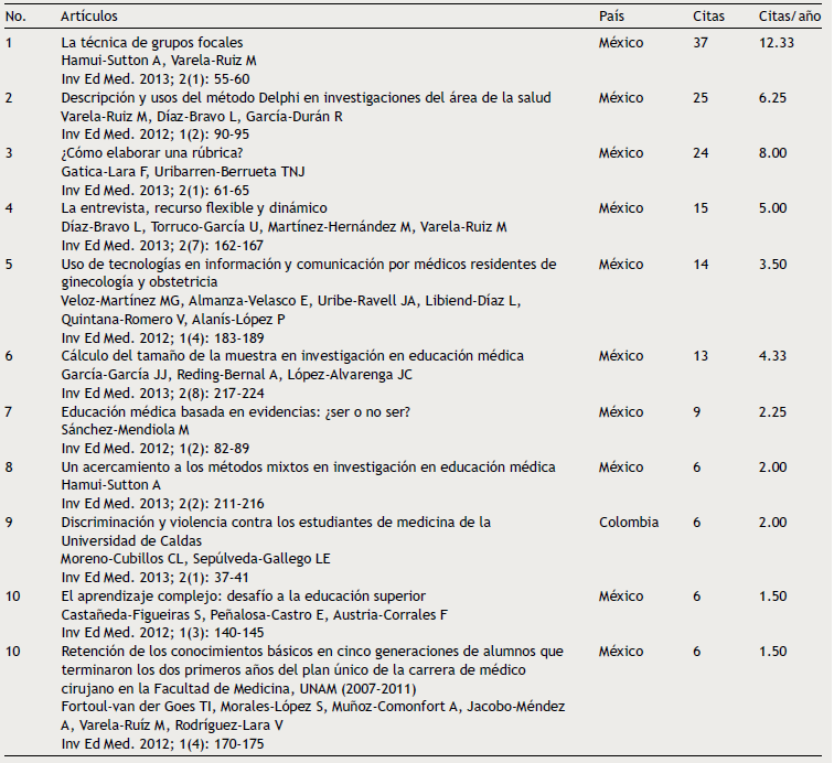 LaTabla 3 muestra la relación de los artículos más citados publicados en el período analizado, destacándose el de Hamui-Sutton y Varela-Ruiz sobre la técnica de grupos focales, que ha recibido 37 citas desde su publicación en el 2013, con un promedio de 12.33 citas por año. Nótese el predominio de la autoría mexicana.