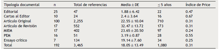 Conclusiones: Las secciones «Artículos Originales» y «Resúmenes» sobresalen como las tipologías documentales más utilizadas. El artículo más citado estuvo relacionado con la técnica de grupos focales. Existió predominio de autoría mexicana, así como de artículos realizados por un solo autor y referencias en idioma inglés. El índice de Price mostró un valor comparable con el de otras revistas de alto impacto.