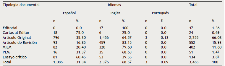 El promedio ± desviación estándar de referencias por artículo osciló entre 1.88 ± 6.42 y 32.47 ± 13.72; la cifra promedio para este indicador fue de 18.05 ± 13.49 referencias por investigación. El índice de Price osciló entre 0.24 y 0.67; el valor promedio para este indicador fue de 0.31 (Tabla 4). De las 3,465 referencias utilizadas: 1,086 (31.34%) eran en idioma español; 2,376 (68.57%) en inglés, y 3 (0.09%) en portugués (Tabla 5).