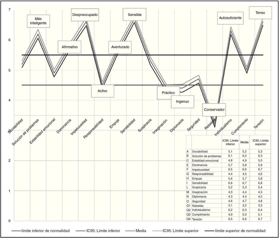 Results: The study included a total of 163 students with a mean age of 19.4 ± 0.95 years, and 58.3% were females. In decreasing order, the higher values were: I (sensibility), F (impetuosity), Q4 (tension), Q2 (individualism), and B (problem solving), while the ones that obtained the lowest values were, from the lowest to the higher: Q1 (rebellion), N (diplomacy), M (imagination), O (confidence), G (responsibility), and C (emotional stability).
