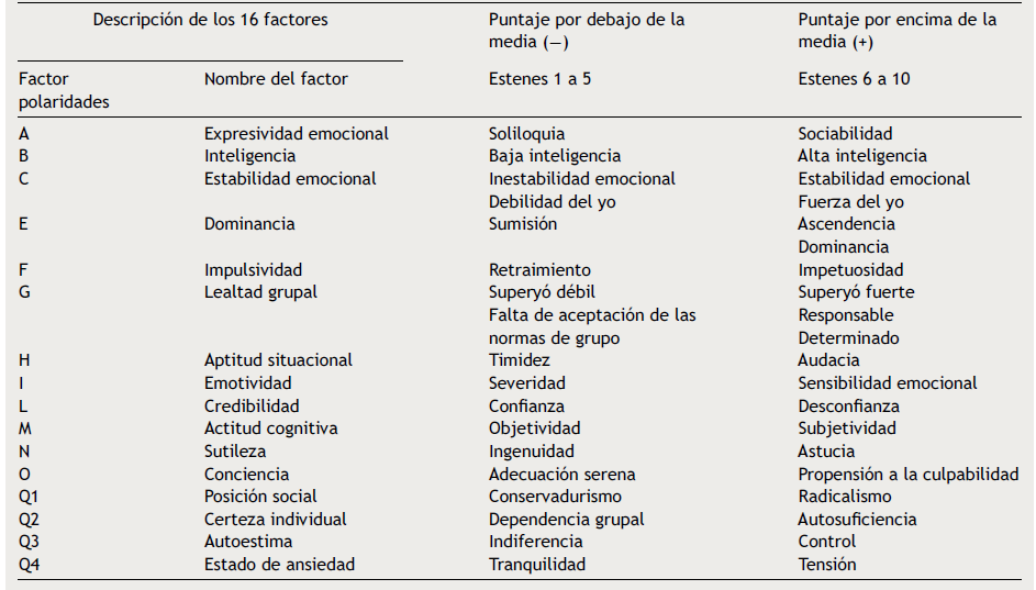 Valora aspectos básicos o primarios de rasgos de la personalidad humana y cuatro dimensiones adicionales (factores secundarios) que son estimados de los factores primarios y representan una síntesis del perfil. Para los fines del presente estudio solo se han utilizado los factores primarios. Cada factor tiene una denominación específica y es identificado con una letra mayúscula, e incluye dos características polaridades (Tabla 1).