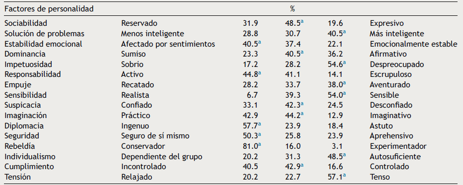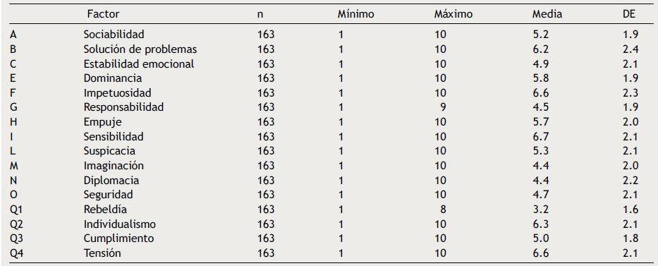 Resultados: Se estudiaron 163 alumnos, con una edad de 19.4 ± 0.95 anos; el 58.3% fueron del género femenino. En orden decreciente, los valores más altos fueron: I (sensibilidad), F (impetuosidad), Q4 (tensión), Q2 (individualismo) y B (solución de problemas), mientras que los que tuvieron valores menores (media menos desviación estándar), en orden de menor a mayor, fueron: Q1 (rebeldía), N (diplomacia), M (imaginación), O (seguridad), G (responsabilidad) y C (estabilidad emocional).