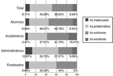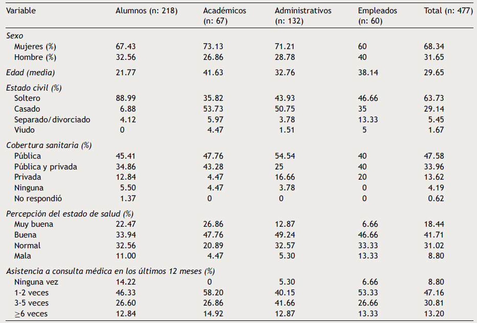 Criterios de inclusión: para los alumnos, pertenecer a la matrícula de estudiantes inscritos en cualquier grado académico, sin importar el curso (la mayoría en materias de verano), durante el periodo del 4 al 22 de julio de 2016; personal docente, hallarse contratado por la institución como profesor, sin importar el tipo de convenio ni el nivel o cátedra impartidos; administrativos, ocupar un puesto oficial dentro de la administración institucional, como encargado, secretario, auxiliar u otro de la misma índole, sin importar el departamento de trabajo; empleados en general, laborar dentro de la universidad en un puesto excluido de los previamente mencionados, a pesar de contar o no con un contrato directo, como quienes se ocupan de la intendencia, mantenimiento o seguridad universitarias. Se incluyeron en todos los apartados a sujetos de los dos campus existentes en la ciudad, pero en su mayoría, especialmente los estudiantes, del central. Quienes podrían clasificarse en más de un estrato, fueron incluidos en el considerado principal por el participante.