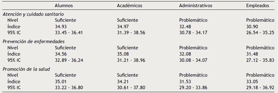 En laTabla 2se señala el resultado por grupo de población, de acuerdo a los subtemas: atención y cuidado sanitario, prevención de enfermedades y promoción de la salud, donde, sin diferencia estadísticamente significativa, se encontró una media de grado problemático en cada uno los rubros mencionados entre administrativos/empleados y suficiente entre alumnos/académicos.