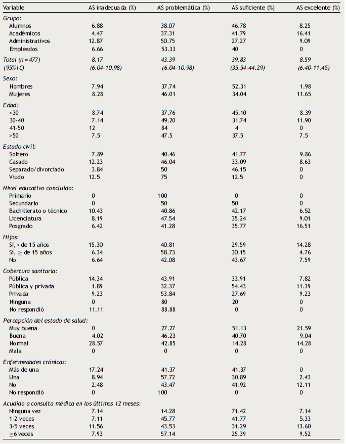 Resultados: El 8.17% presentó un índice de alfabetización en salud inadecuado; 43.39%, problemático; 39.83%, suficiente; 8.59%, excelente. Las variables asociadas más significativamente (p < 0.01) con un resultado deficiente fueron: pertenecer al grupo de administrativos, padecer enfermedades crónicas, uso frecuente de los servicios de urgencias, constante asistencia a consultas médicas y sedentarismo.