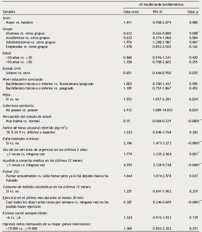 Los porcentajes relativos de cada nivel de alfabetización, según las principales variables sociodemográficas y de salud, se muestran en laTabla 3; datos que a su vez se emplearon para la base del análisis correlacional que se presenta en laTabla 4(donde se incluyen antecedentes más amplios). Los factores asociados con un resultado deficiente (inadecuado/problemático), los cuales caracterizan el perfil de la población teóricamente más vulnerable fueron: formar parte del grupo de administrativos (OR 1.976, p = 0.001); tener hijos (OR 1.553, p = 0.024); no contar con cobertura sanitaria (OR 3.912, p = 0.024); padecer alguna o varias enfermedades crónicas (OR 2.196, p < 0.0001); usar los servicios de urgencias en los últimos 2 años (OR 1.779, p = 0.001); acudir a consulta médica en los últimos 12 meses (OR 4.555, p < 0.0001); fumar actualmente (OR 1.664, p = 0.021). Se asociaron con un resultado satisfactorio (suficiente/excelente): pertenecer al grupo de alumnos (1.632, p = 0.080); estado civil soltero (OR 1.534, p = 0.025); percepción del estado de salud como muy bueno vs. normal (OR 6.666, p < 0.0001); en el último mes, haber realizado ejercicio casi todos los días/varias veces por semana vs. ninguna vez/no haber podido hacer ejercicio (OR 2.577, p < 0.0001).