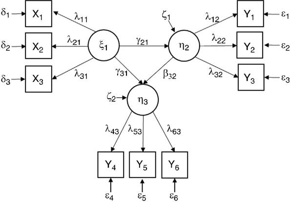 Para plantear las ecuaciones asociadas al modelo, es necesario que en primer lugar se represente gráficamente. Una variable observada se simboliza por medio de un cuadrado, una latente por un círculo o elipse, una asociación con una flecha unidireccional y una correlación con una flecha bidireccional. En la Figura 1 se muestra un modelo estructural que contiene 3 variables latentes ξ1, η2 y η2. La primera corresponde a una variable latente independiente (ξ1) ya que a ella no llega ninguna flecha y, por el contrario, las otras 2 (η2 y η2) son dependientes ya que les llega al menos una flecha. Cada una de estas 3 variables latentes está medida a través de 3 variables observadas. Nótese que se destacan las observadas asociadas a la latente independiente como X, mientras que para las latentes dependientes con Y.