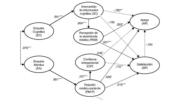 Las pruebas que hicieron para evaluar la confiabilidad de las variables latentes no se abordarán en este trabajo, por lo que sugerimos que para mayor detalle se consulte el artículo. Para estimar y evaluar el modelo se utilizó el paquete EQS 5.7. Se ajustaron 2 modelos: un confirmatorio y uno de ecuaciones estructurales, aunque solo discutiremos el segundo (Figura 2). Cabe mencionar que ambos modelos tuvieron un ajuste muy bueno. Para el segundo modelo se reportó una x2(467) = 1,066.992 con p < 0.001, CFI = 0.931 y RMSEA = 0.049. Considerando el valor de estos 3 índices se puede concluir que el modelo tiene buen ajuste, aunque hubiese sido importante que se mostraran otros índices de incremento. En la Figura 2, los autores destacan con una flecha sólida aquellos coeficientes que resultaron muy significativos (p < 0.001) y con flechas punteadas los que fueron poco o nada significativos. El modelo mostró que la correlación entre la EC cognitiva y afectiva es positiva y muy significativa (p < 0.001). Se confirmó que el médico que tiene mayor EC tiene mayor IIC (0.951, p < 0.001) y que a mayor IIC, mayor PEM (0.804, p < 0.001). A mayor EA, es la RM-P (0.951, p < 0.001), y a mayor RM-P se incrementa la CIP (0.767, p < 0.001). El efecto directo que tiene la IIC en la SP y el AP fue negativo en ambos casos, pero significativo solo con el AP, conclusión que es contraria a lo que se habían planteado. En el caso de PEM, tiene un efecto similar en SP (0.507, p < 0.001) y en AP (0.503, p < 0.05). Tanto RM-P como CIP tienen un efecto directo positivo en SP y AP, aunque la magnitud de los coeficientes es mayor en RM-P con SP y AP (0.519 y 0.639) que en CIP con SP y AP (0.172 y 0.246).