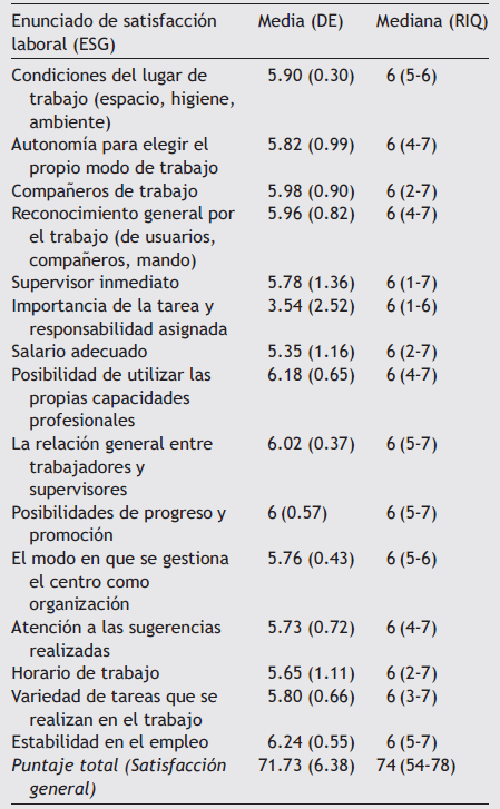 La media del puntaje total de satisfacción general fue 71.73 (DE= 6.38). El nivel de satisfacción con la «estabilidad en el empleo» fue el más alto, seguido de la posibilidad de utilizar las propias capacidades profesionales, la relación general entre trabajadores y supervisores y las posibilidades de progreso y promoción. Los puntajes de satisfacción más bajos se reportaron en la importancia de la tarea y responsabilidad asignada y el salario recibido (Tabla 1).