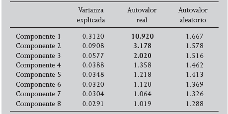 Si bien con la lógica de la regla de Kaiser fueron obtenidos ocho componentes, una vez que se implementa el análisis paralelo el número de componentes que serán extraídos se reduce drásticamente a tres. Esta es una cantidad compatible con la estructura original del instrumento1 y que tendría, en consecuencia, un mayor respaldo teórico. Además, siendo el objetivo del análisis factorial obtener una estructura parsimoniosa, resulta claro que extraer tres factores será más ventajoso que ocho (además, los últimos presentaban coeficientes de confiabilidad bastante bajos), y brindaría a los investigadores que deseen emplear ese instrumento evidencia más robusta sobre su dimensionalidad.