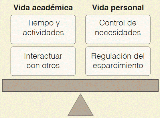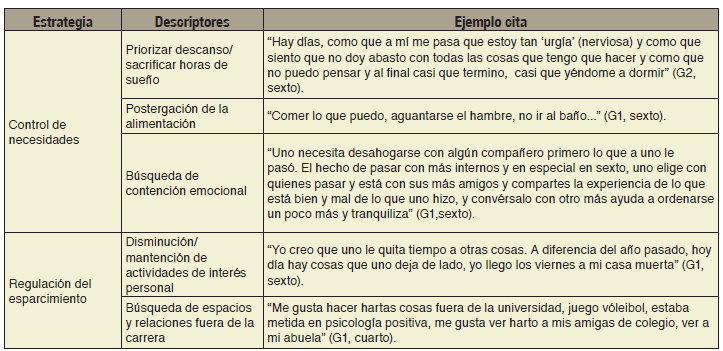 La vida personal (Tabla 3) se relaciona con la integración entre vida académica y tiempo libre. Las estrategias emergentes refieren al control de las necesidades y la regulación del esparcimiento. Respecto del control de necesidades, los estudiantes manifestaron una fuerte tensión entre la necesidad de descansar y la demanda de tiempo que requiere del estudio. Algunos señalaron priorizar el descanso para mantenerse activos, y otros sacrificar horas de sueño para estudiar. Lo mismo ocurrió con la alimentación: algunos intentan alimentarse bien para mantenerse sanos; otros, la ven como una necesidad que hay que controlar y así aprender a funcionar "con hambre".