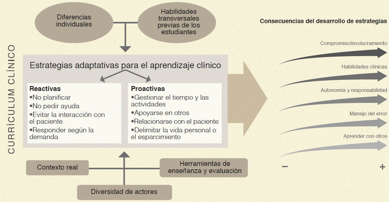 Results: The strategies reported were contextualized and cover the academic and personal realms. These revealed different attitudes: some with a more active orientation and others more reactive. In the academic context the strategies referred to the management of time, activities and relationships with others. In the personal realm to the control of basic needs and recreation. An interpretive model is proposed to explain the phenomenon of adaptation to the clinic and its implications in training. These adaptation strategies revolve around five areas of action: academic engagement, development of clinical skills, autonomy and responsibility, handling of error and relationships with others.