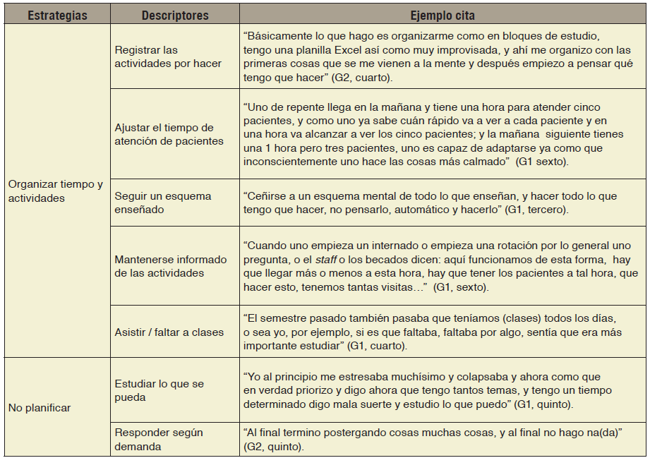 En la vida académica, las estrategias de organización de tiempo y actividades refirieron a asumir el tiempo como un recurso limitado, que debe gestionarse para cumplir con las obligaciones académicas (Tabla 1). Algunos estudiantes declararon organizarse usando un cronograma, ajustar el tiempo de atención de pacientes, seguir un esquema definido, mantenerse informado y asistir o no a clases, en función del tiempo disponible. Asimismo, se puede visualizar el aprendizaje respecto al "modo en que se hacen las cosas". La generación de rutinas de actividades y el seguimiento a las condiciones pre-establecidas por la persona a cargo sería también un facilitador para el aprendizaje en la clínica y operarían como estructuras de apoyo para los estudiantes.