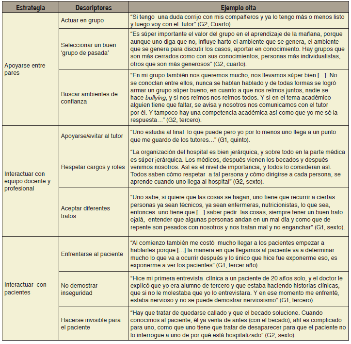 Un segundo grupo de estrategias que los alumnos consideran muy relevante para el aprendizaje en el contexto clínico fueron "las relaciones con otros" (Tabla 2). Los demás operarían tanto como agentes protectores como amenazantes. Describieron como estrategias el apoyo entre pares ('actuar en grupo', 'seleccionar un buen grupo de pasada o compañeros de curso en una rotación') y la búsqueda de ambientes de confianza. Ello les permitiría desempeñarse bien en las actividades, protegerse, pedir ayuda, dividir tareas y generar espacios que disminuyan la tensión.