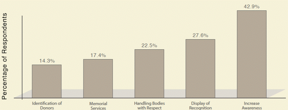 Various suggestions were documented by the respondents which according to them would enhance the voluntary body donation program in India (Figure 2). The most popular (42/98;42.9%) advice was to increase awareness among general population, followed by display of recognition for donors in anatomy department of respective medical schools which was suggested by 27 (27/98; 27.6%) respondents. 22 (22/98; 22.5%) respondents felt that measures should be taken to ensure that donated bodies are handled with respect, 17 (17/98; 17.4%) were in favour of holding memorial services for those who have donated their bodies and 14 (14/98; 14.3%) respondents opined that identification of interested donors would yield desired output in this regard (Figure 2).