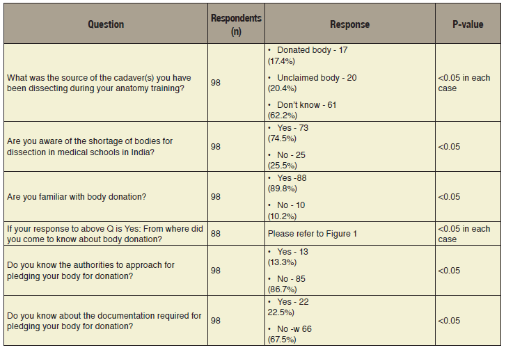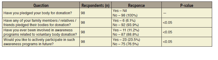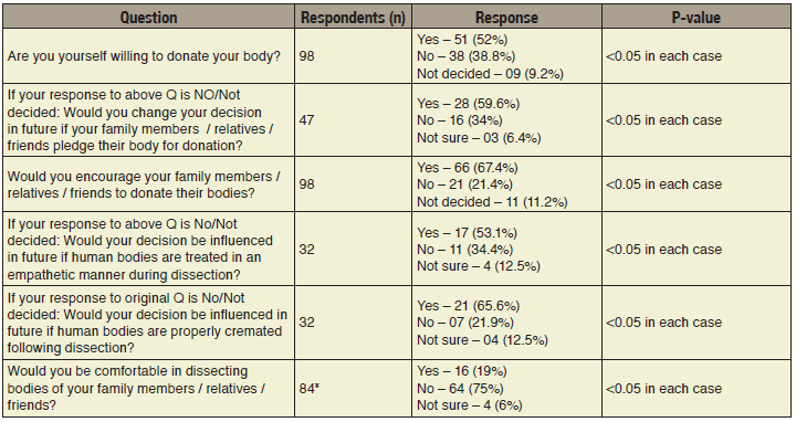 Results: Although it was noted that 74.5% respondents were aware of the shortage of human bodies for teaching anatomy in Indian medical schools and 52% responded in favour of donating their bodies in the future, however, just 6.1% of their relatives had made the same decision.