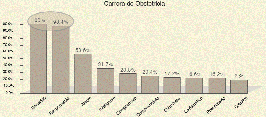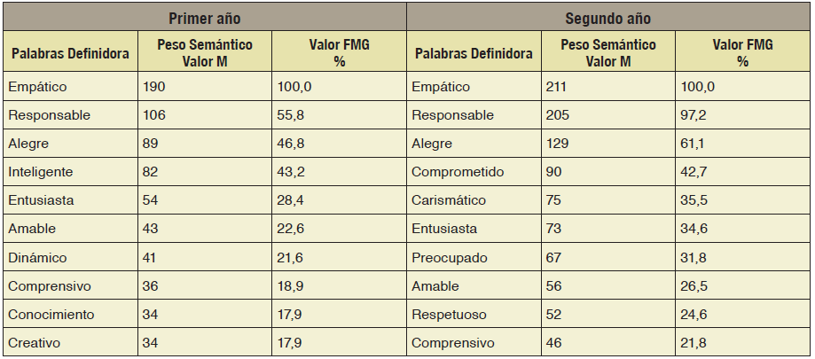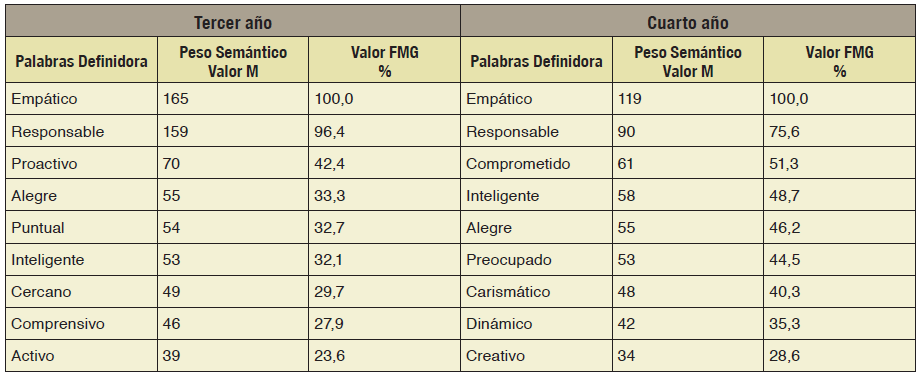 Results: A total of 260 definitory words were obtained, among which the ones with a higher semantic weight for the group under study were Empathic and Responsible, with 100% and 98,4%, respectively. The second group of relevant terms included Happy (53.6%) and Intelligent (31.7%). The concepts definition was similar across all student groups. However, first year students give more emphasis to the concept Support (100%) compared to fourth year students, who in contrast consider Commitment (51.3%) more relevant.