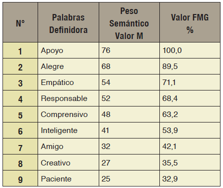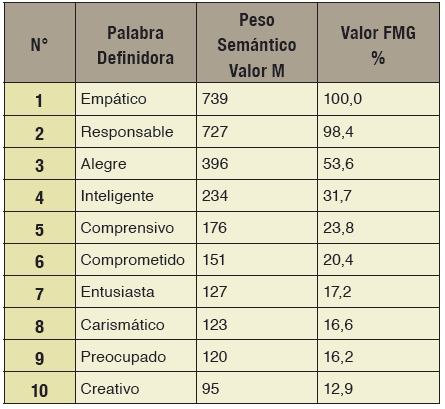 Para los estudiantes que ingresaron a la educación universitaria, aun cuando consideraron las palabras empático y responsable con un valor FMG mayor a 50%, no fueron las más relevantes; sino apoyo y alegre (Tabla 3).
