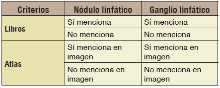 Tras la revisión de los textos y atlas de anatomía humana se determinó que existe discrepancia entre el uso del término nódulo linfático y ganglio linfático. Encontrando ocho autores quienes hacen referencia a ganglio linfático, por otra parte, apreciamos que seis autores hacen mención al término nódulo linfático, así como establece la Nomenclatura Internacional de Anatomía Humana. Para identificar el uso adecuado del término en discrepancia utilizamos el criterio de revisión exploratoria de libros y atlas de anatomía humana, para lo cual se diseñó una tabla que detalla los criterios y parámetros de clasificación, en consecuencia, logramos identificar y analizar los resultados (Tabla 1).