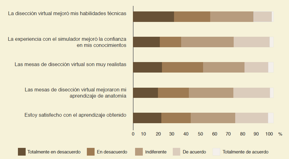 Presentamos los resultados en la Figura 1. Un 25,6% de los estudiantes estuvieron totalmente de acuerdo con las afirmaciones: "La experiencia de disección virtual mejoró la confianza en mis conocimientos" y "Las mesas de disección virtual mejoraron mi aprendizaje de anatomía. Las dos expresiones que tuvieron menor valoración por los estudiantes fueron: "Las mesas de disección virtual son muy realistas", y "la disección virtual mejoró mis habilidades técnicas".