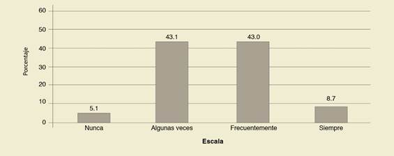 El 86.1% (1,673 alumnos) de las respuestas globales se ubican en los intervalos intermedios, algunas veces y frecuentemente; en los extremos el 8.7% (172 alumnos) las utiliza siempre y sólo el 5.1 % (101 alumnos) no utilizan algún tipo de estrategia(figura 1).