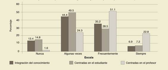 En el intervalo de “nunca”, sólo el 1.6% de los participantes afirma que su profesor nunca utilizó estrategias centradas en el profesor y entre un 13% y 14% afirman que nunca emplearon las estrategias integradoras y centradas el estudiante. En el intervalo de “algunas veces” entre el 44% y 49% se asocian a la integración del conocimiento y las centradas en el estudiante y sólo el 24% afirma utilizarlas en “algunas veces”. En el siguiente intervalo más de la mitad afirma usar frecuentemente las estrategias centradas en el profesor y entre un 28% y un 35% afirman usar frecuentemente las estrategias asociadas a la integración y las centradas en el profesor; por último, el 22% indica que siempre emplea estrategias centradas en el profesor y entre el 6% y el 7% emplea estrategias integradoras o centradas en el estudiante (figura 2).